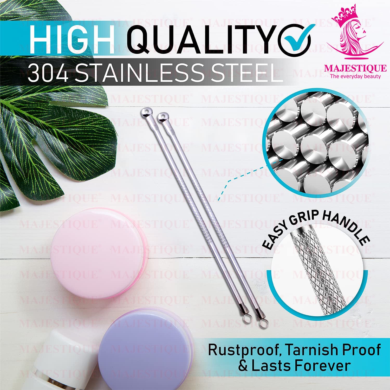 Majestique blackhead remover's dual-sided heads help remove different dimensions of blackheads or whiteheads on the face or skin and keep it clean and smooth. Premium stainless steel material with a polished design minimises the risk of bacterial infection. Its anti-slip handle design allows you to hold firmly and easily remove mature acne. Professionally designed, this blackhead extractor with a sturdy anti-slip handle design provides better handle control to ensure every step can be done with exceptional control and precision to avoid damage to the skin. It is a great tool for professional dermatologists, beauticians, makeup artists, and common women. It is also widely used in spas and salons for blemishes, pus removal, acne, pimples, and other facial impurities' treatment. You will appreciate the versatility of this blackhead remover, as it will provide for all your whitehead, milia, pimple, and general comedone extractor needs.