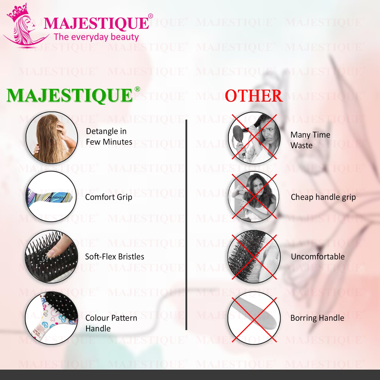 Majestique detangler Brush with pattern design has a soft touch handle for a more comfortable hold. The flexible cushion base massages your scalp and acts as a mini shock absorber for stress-free brushing. Ball tipped bristles will not snag or pull hair while you detangle and style. This wide headed brush is designed to gently detangle wet or dry hair. Use it for everyday brushing of all hair lengths or Ideal for brushing through thick hair, this brush has a soft-touch grip and flexible cushion base to make it easier to manage busy, unruly locks. Especially good for thick hair.