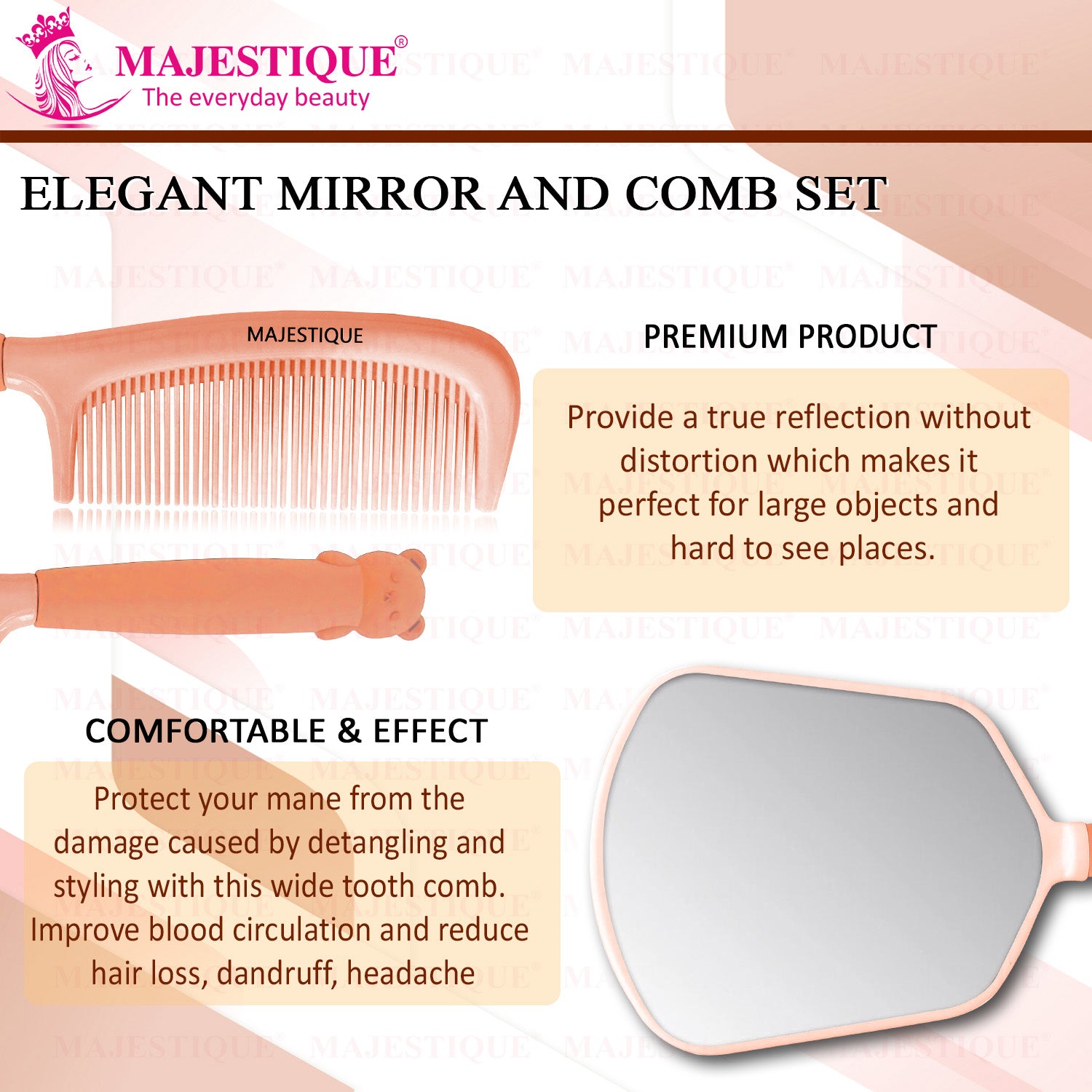 Majestique Elegant mirror and comb set, Designed with both usefulness and style in mind. The handles are made of strong ABS plastic and feature cute teddy heads, bringing a touch of elegance to your style. The rubber grip provides a comfortable and solid grip, which improves your grooming experience. The set includes an elegant mirror with versatile uses, perfect for makeup application, shaving, and facial care. This makeup mirror, also known as a mirror makeup, small mirror for purse, compact mirror, and handle mirror, is a versatile accessory for your daily grooming routine. The mirror is accompanied by a detangling handle comb. Simply grasp the comb by the handle and slide it through your hair from top to bottom or sideways to create the desired look. For successful detangling, separating tangled hairs, maintaining cleanliness, and styling, use gentle pressure. This kit is perfect for everyday personal usage and makes a lovely gift.