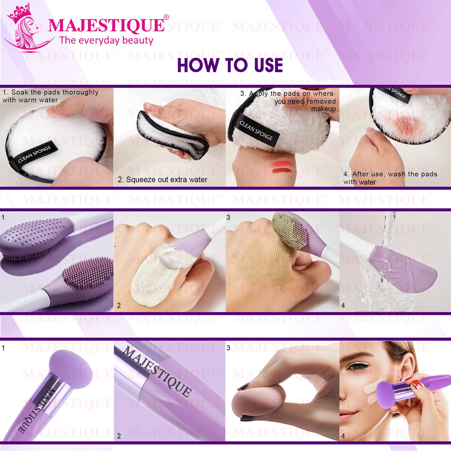 Majestique reusable multi-functional set, a versatile beauty essential designed to elevate your skincare and makeup routine. The set includes a specially crafted round facial cleansing pad, featuring a dual-sided design. This multi-functional marvel is also known as microfiber reusable makeup remover sponge pads, ideal for deep cleansing and makeup removal. The mushroom blender, a key component of this set, serves as a powder puff cosmetic sponge and makeup blending tool. With its innovative design, this sponge-face brush is perfect for both dry and wet use with liquid, creams, and powders. The handle case ensures convenience and portability, making it an ideal tool for flawless makeup application. Facial applicator, a three-sided mask brush gives you benefits of a silicone face applicator which makes it easy to apply thin layers of skincare products evenly. Whether it's a face mask, serum, or cream, this tool ensures a flawless and uniform application, giving your skin the care it deserves. Invest in the Majestique reusable multi-functional set to transform your beauty regimen. From effective makeup removal to flawless application, this set is your go-to solution for a radiant and polished look.