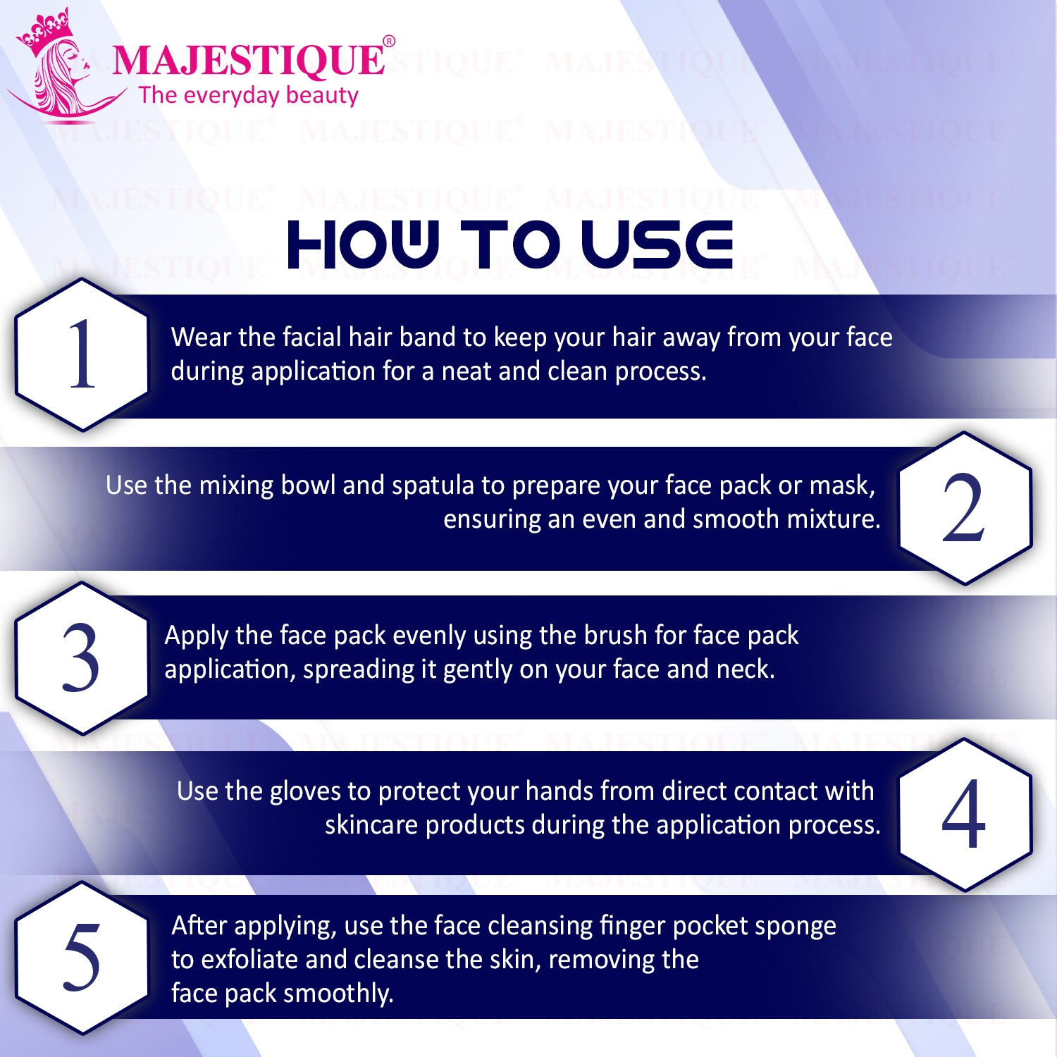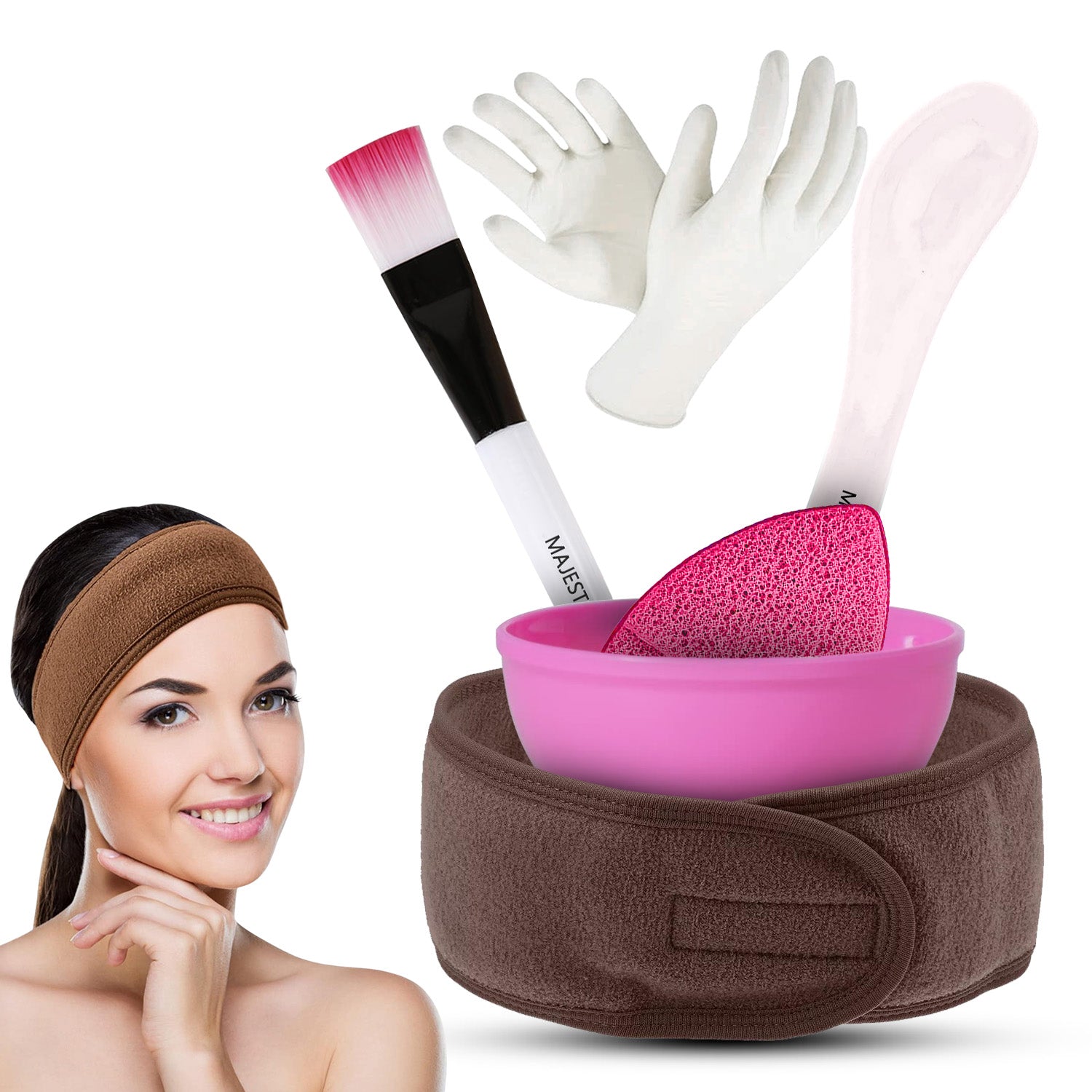 • Includes face pack brush, mixing bowl, spatula, facial hair band, gloves, and face scrubber.