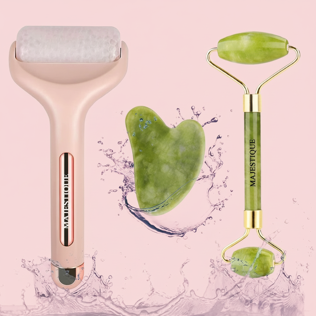 Majestique face massage kit, a revolutionary trio designed to elevate your skincare routine. This comprehensive set includes three exquisite tools: the ice roller, jade roller, and gua sha, all crafted for rejuvenation, ensuring a refreshing and soothing skincare experience. Experience skin transformation as these tools work collectively to reduce pore size, enhance skin tone, and promote fluid flushing. The result? Refreshed and revitalised skin that radiates a natural glow. The ice roller takes centre stage with its unique benefits, strengthening collagen fibres to foster firm and elastic skin. Watch as wrinkles and crow's feet diminish, leaving you with a youthful and rejuvenated appearance. Crafted from stone, the jade roller and gua sha bring detoxification to the forefront. These tools aid in purifying hazardous waste through venous return, reducing varicose veins, and alleviate tension, offering a holistic approach to skincare. To enhance your skincare ritual, refrigerate the ice roller head at 1-4 degrees celsius for 15-30 minutes before use. This simple step adds a layer of coolness to the massaging experience, providing a spa-like sensation in the comfort of your home. Elevate your massager for face tools routine with the Majestique facial massager set, a perfect blend of innovation and luxury. Transform your skincare journey and embrace the cool, rejuvenating touch that this set brings to your daily routine.