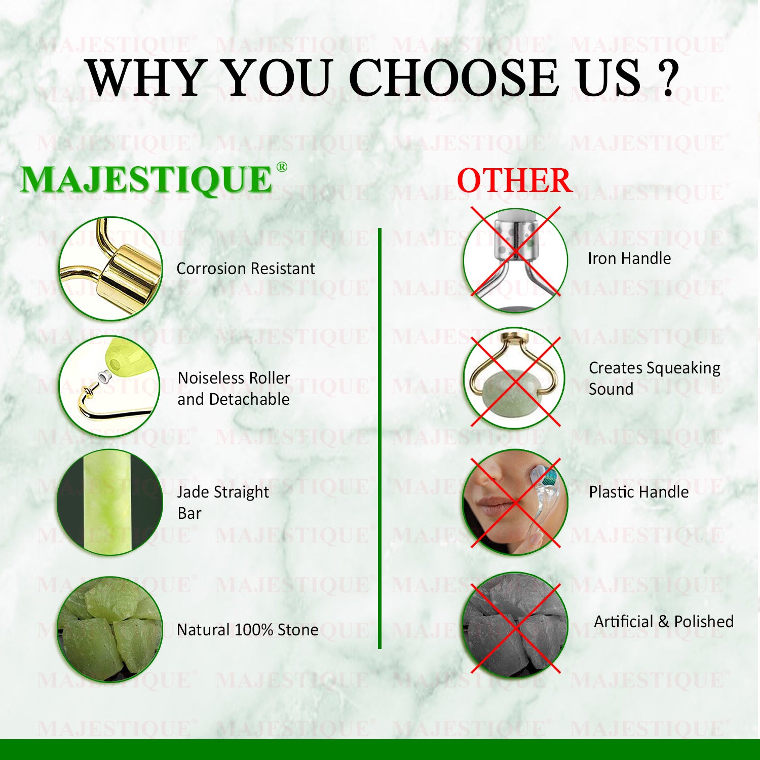 Majestique jade roller is less likely to fall off the metal part and is designed to deliver noiseless rolling without any squeaks. Our jade-faced roller has a delicate and smooth rolling surface and is built on a sturdy integrated frame with a curved handle to ensure reliable use. Jade is known as a lucky stone as it magnifies energies of love, wealth, and health. Jade is connected to the heart chakra, promoting self-love and healing. Start with a clean face and prep the skin with a facial oil or serum. The face rollers help in increasing collagen production, lymphatic system stimulation, and blood circulation in the skin to provide sufficient oxygen, giving you dull-free skin and a youthful glow. After using the jade roller for a while, your face and eye area will look significantly different. It will enhance blood circulation and tighten the skin, thereby reducing wrinkles and dark circles.