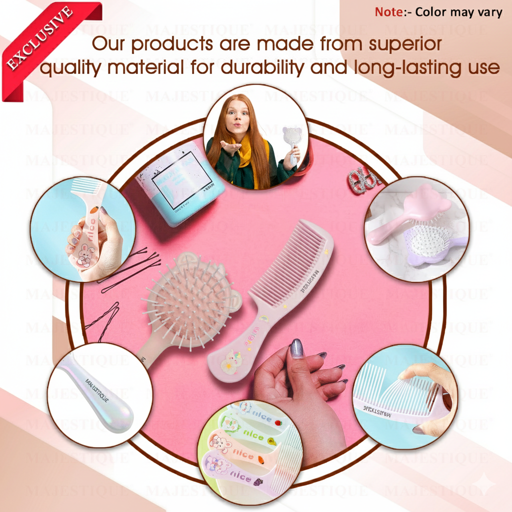 Pamper your little one's hair effortlessly with the Majestique Kids Hair Grooming Set. This set includes a detangling brush and a soft comb, designed to make hair care easy and stress-free. The brush gently detangles rough hair and gives it a shiny, smooth look, while massaging your child's soft scalp and controlling frizz. The round-tip bristles ensure it doesn't hurt the scalp, and the strong grip makes it easy to use. Compact and lightweight, this set is perfect for carrying in your bag, making it ideal for travel. It's gentle, relaxing, and perfect for babies and toddlers. Parents love how it reduces knots and prevents scalp pain. It's especially great for curly hair, making combing a breeze without tears. Majestique kids hair grooming set searches by various names such as hair comb for kids, comb for kids girls, kids comb for girls, kids comb, small hair brush, mini hair brush and kids combs. This grooming set is a must-have for every parent and is worth all the hype. Keep your child's hair looking great on the go with this durable and handy set.