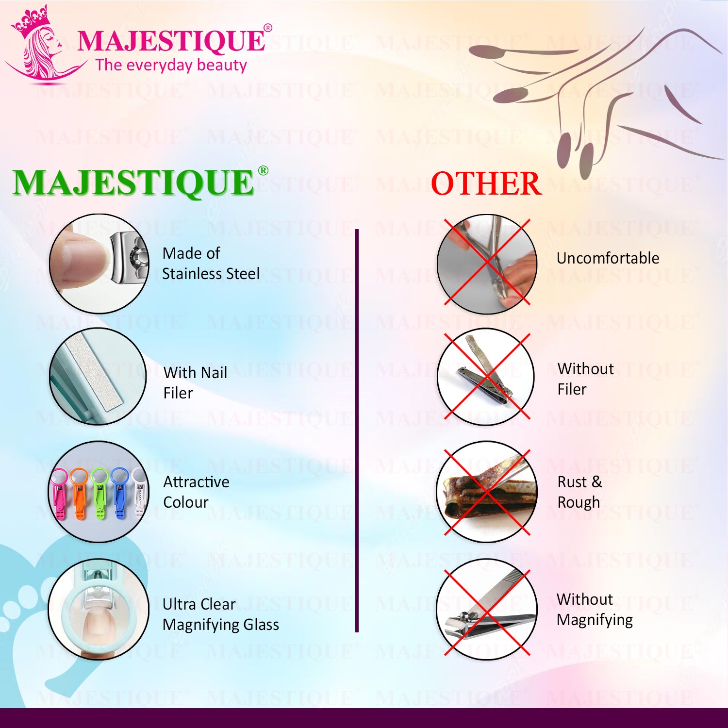 The Majestique Nail clipper with magnifying glass is a revolution in nail care. Be prepared to be blown away by its revolutionary design and amazing functionality. This nail clipper's highlight feature is its huge magnifying lens, which exceeds expectations in size and clarity. It provides a magnified perspective, making nail clipping simple and accurate. Crafted from strong stainless steel, this nail trimmer ensures a sharp and smooth cutting edge and file, making it suitable for both fingernails and toenails. Its sturdy construction guarantees durability and long-lasting performance. Furthermore, the ergonomic design makes it extremely comfortable to grip and use. Whether you have thick or thin nails, this clipper consistently produces excellent results. This Majestique Nail clipper with magnifying glass searches by various names such as nails cutter, nail cutter for men big size, big nail cutter for thick nails, nail cutter machine, nailcuttter and nail clipper. The Majestique nail clipper combines innovation and practicality to provide the ideal nail care solution.