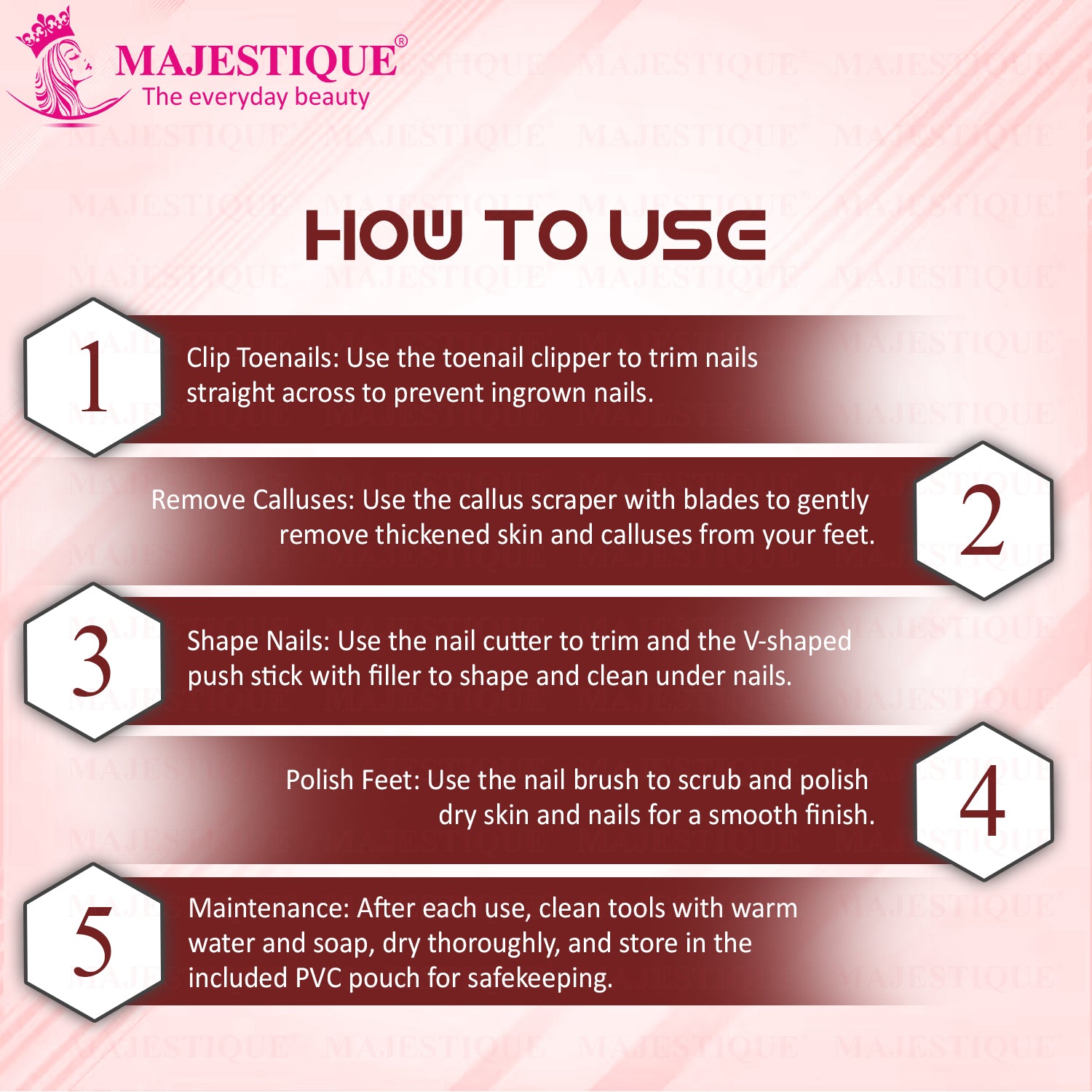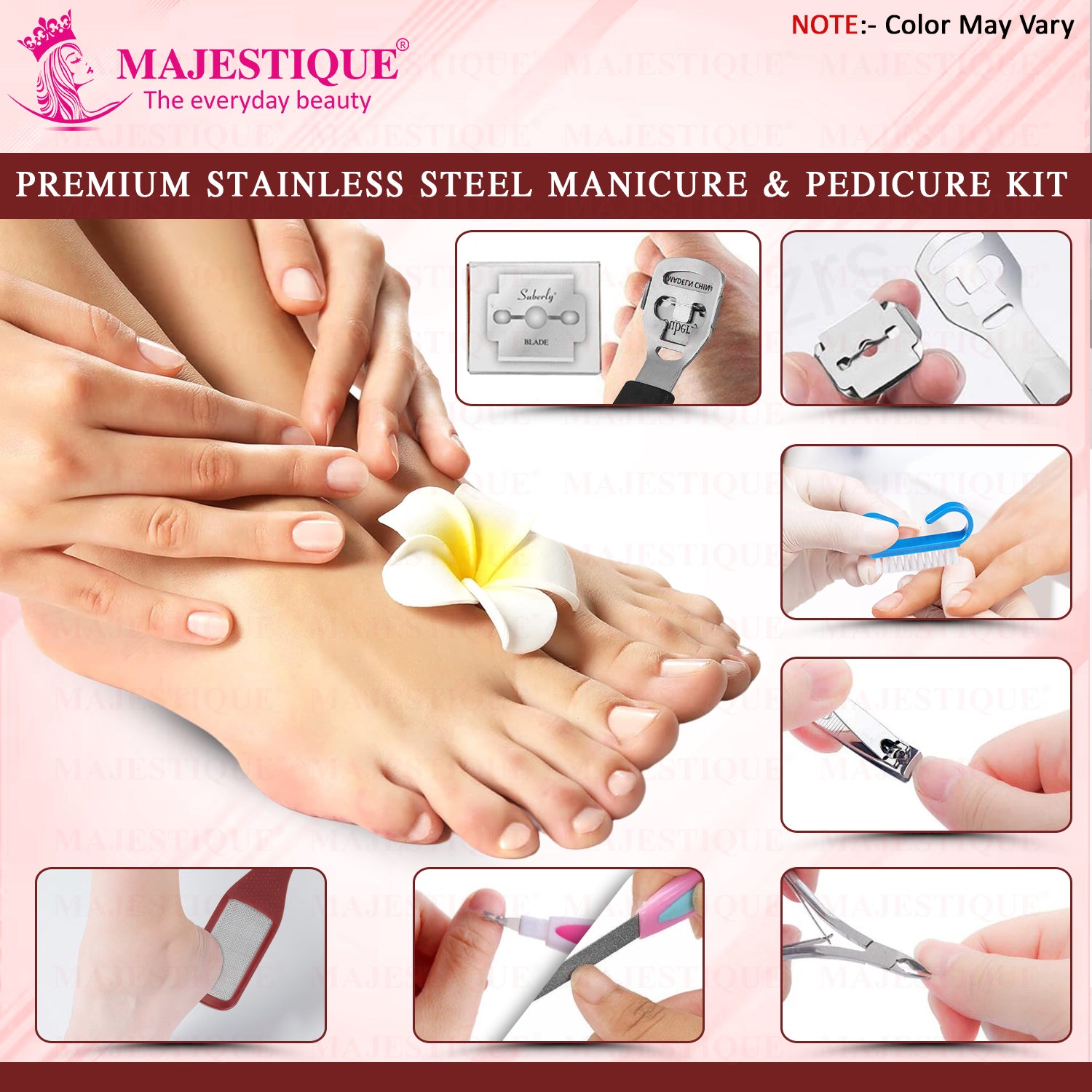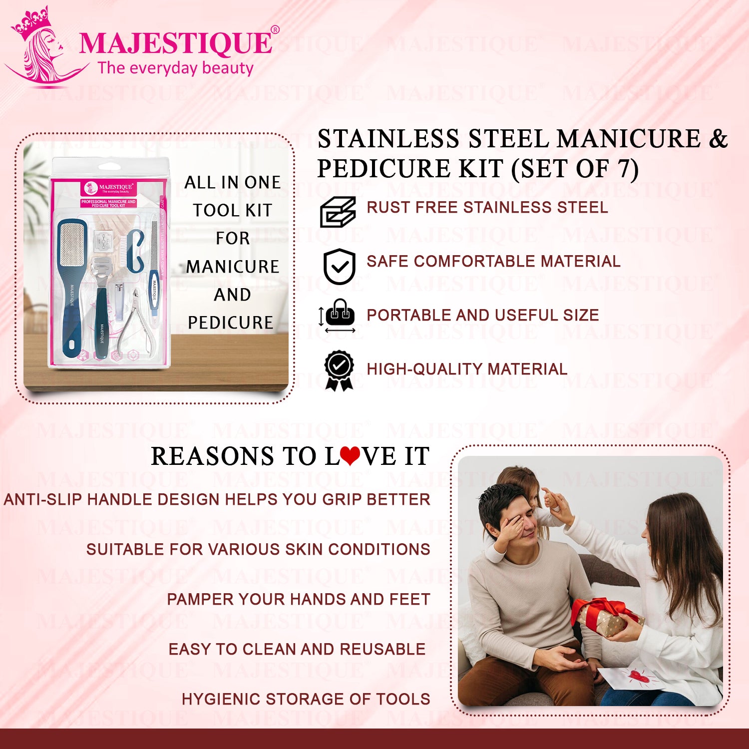 Transform your feet with our professional manicure and pedicure tools kit. Easily remove calluses and dead skin, revealing soft, beautiful feet. Crafted from high-end, anti-rust stainless steel, our durable tools are ergonomic and easy to grip. This all-in-one set allows you to eliminate thick calluses, polish dry skin, and shape nails, leaving your feet baby-soft and smooth. Ideal for personal or professional use, the kit includes 7 essential tools: toenail clipper, callus scraper with blades, V-shaped push stick with filler, nail brush, and nail cutter. Tools kit comes with pouch packing, allowing all accessories to be securely stored after use. Compact and portable, it's perfect for travel. Majestique Manicure and Pedicure tools kit searches by various names such as pedicure scrub, pedicure scrubber for feet, foot scrapper, heel scrubber, leg scrubber and foot crack remover. Each tool is designed for maximum utility, making it a fantastic gift for any occasion like Diwali, Father's Day, Christmas, New Year, Mother's Day, or Valentine's Day. Treat yourself or someone special to our Majestique nail clippers manicure kit and experience complete hand and foot care in one elegant package.
